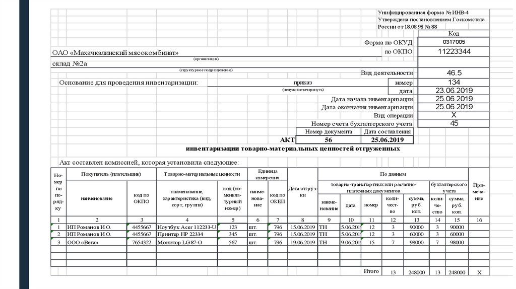 Инвентаризация товаров отгруженных оформляется актом унифицированной формы № ИНВ-4.