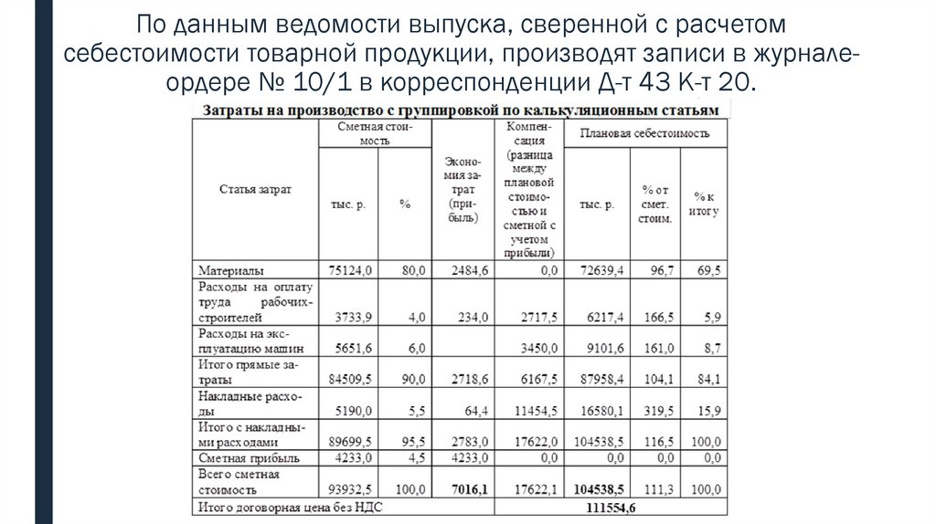 По данным ведомости выпуска, сверенной с расчетомсебестоимости товарной продукции, производят записи в журналеордере № 10/1 в корреспонденции Д-т 43 К-т 20.