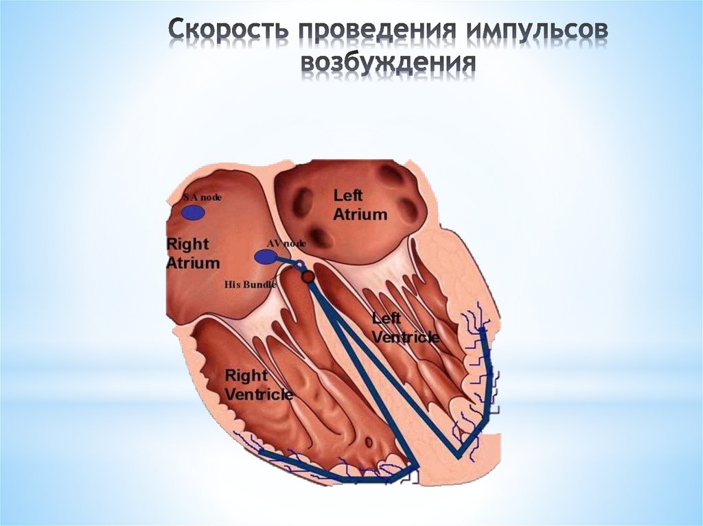 левого предсердий к перегородке между ними. Скорость проведения возбуждения по