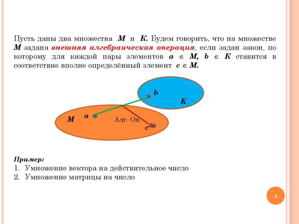 Пусть даны два множества М и К. Будем говорить, что на множествеМ задана внешняя алгебраическая операция, если задан закон, по