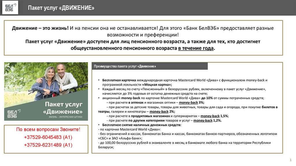 Пакет услуг «ДВИЖЕНИЕ»Движение – это жизнь! И на пенсии она не останавливается! Для этого «Банк БелВЭБ» предоставляет разные