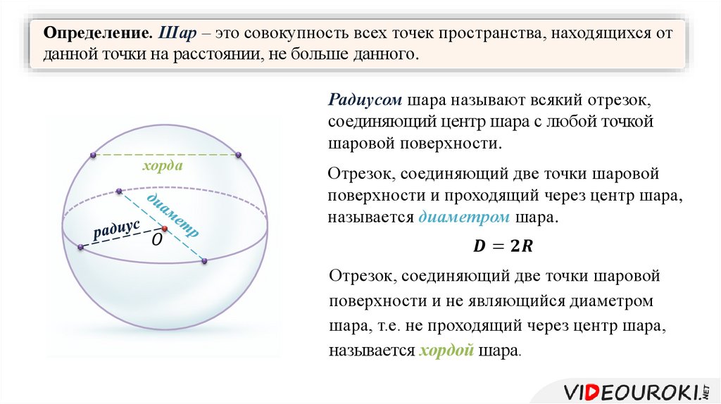 Определение. Шар – это совокупность всех точек пространства, находящихся отданной точки на расстоянии, не больше данного.