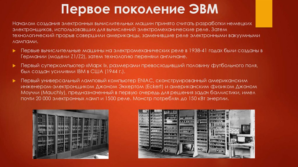 Первое поколение ЭВМНачалом создания электронных вычислительных машин принято считать разработки немецких