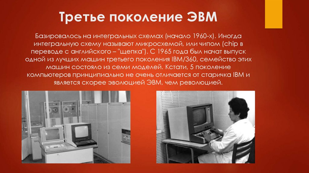 Третье поколение ЭВМБазировалось на интегральных схемах (начало 1960-х). Иногда