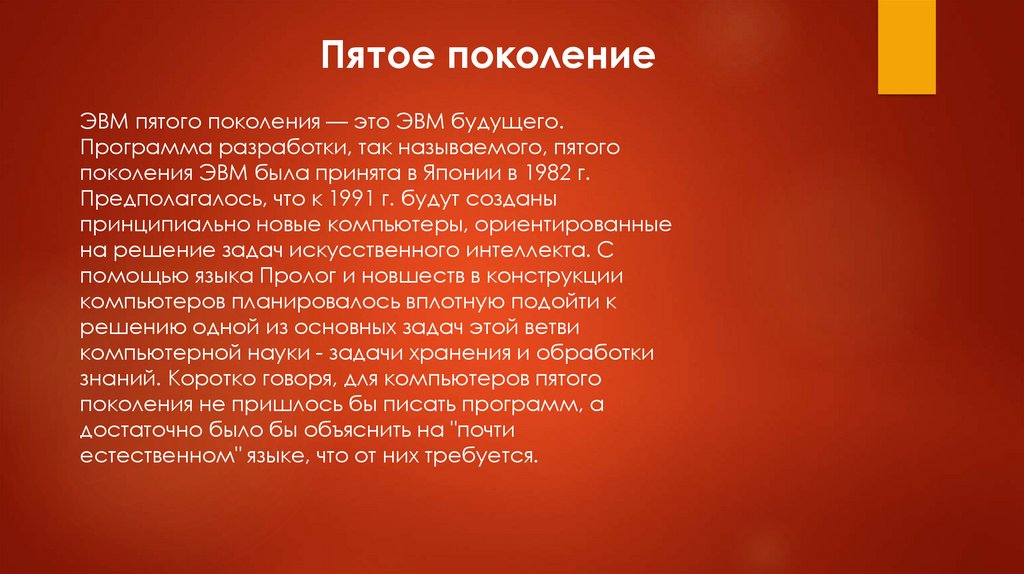 Пятое поколениеЭВМ пятого поколения — это ЭВМ будущего.