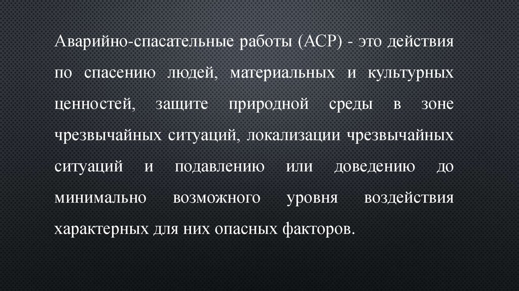Аварийно-спасательные работы (АСР) - это действияпо спасению людей, материальных и культурных