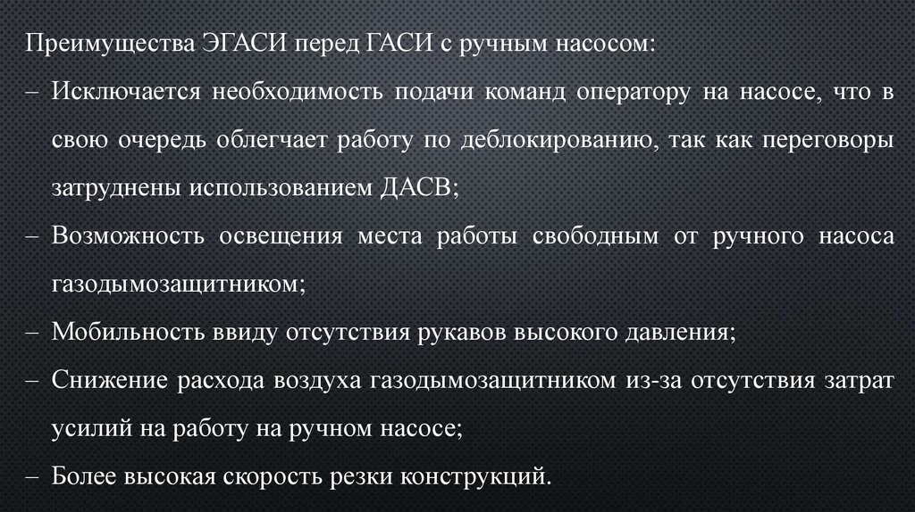 Преимущества ЭГАСИ перед ГАСИ с ручным насосом:– Исключается необходимость подачи команд оператору на насосе, что в