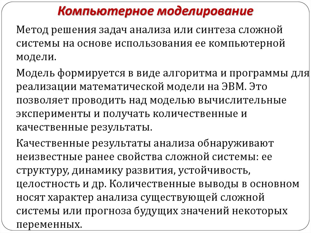 Компьютерное моделированиеМетод решения задач анализа или синтеза сложной
