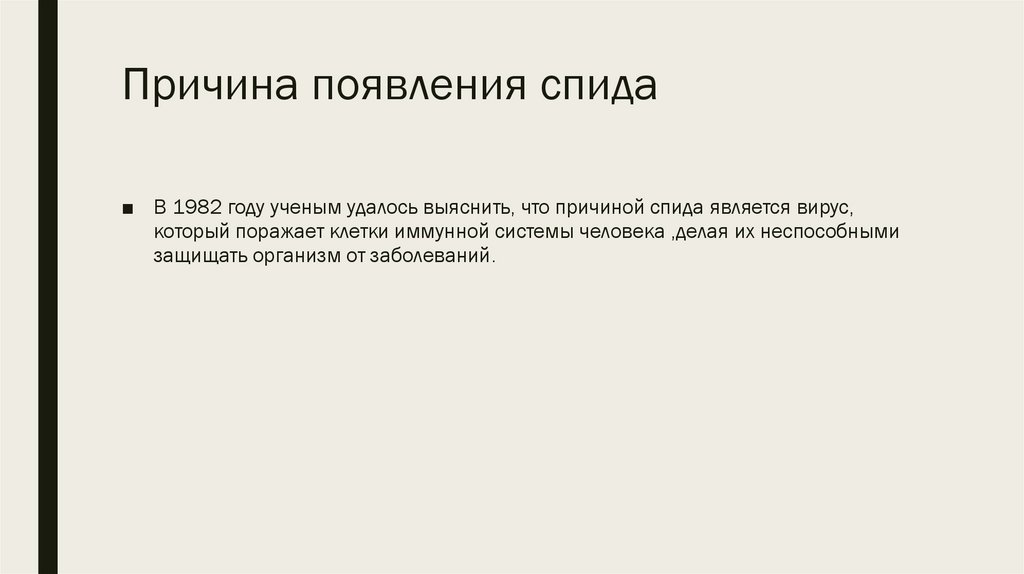 Причина появления спида■ В 1982 году ученым удалось выяснить, что причиной спида является вирус,