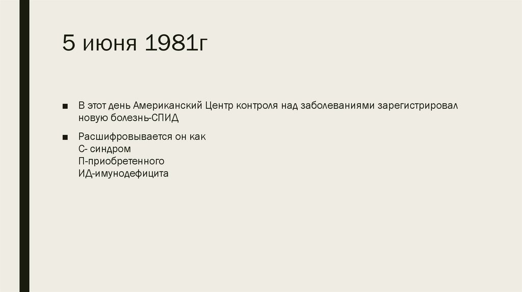 5 июня 1981г■ В этот день Американский Центр контроля над заболеваниями зарегистрировал