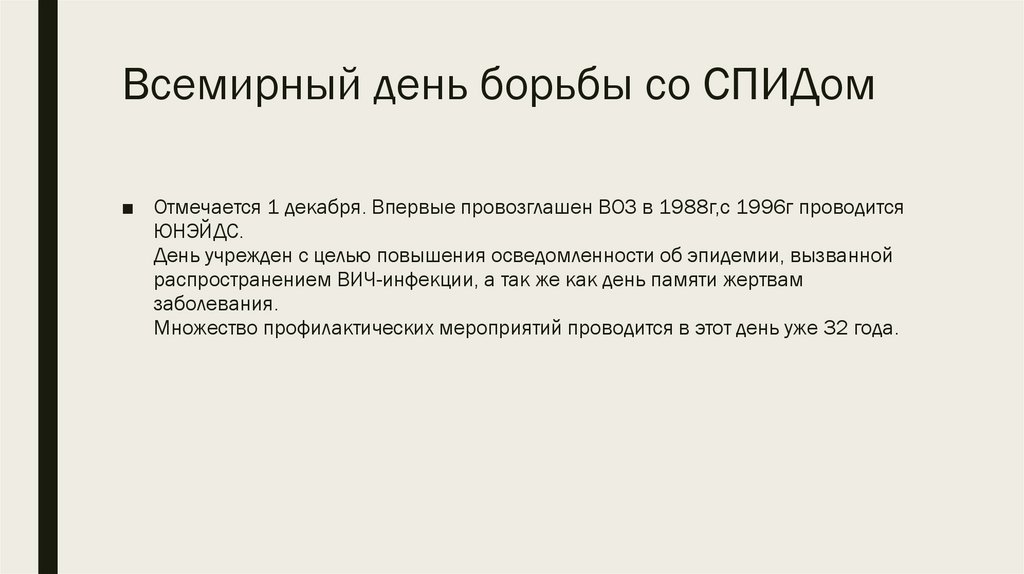 Всемирный день борьбы со СПИДом■ Отмечается 1 декабря. Впервые провозглашен ВОЗ в 1988г,с 1996г проводится