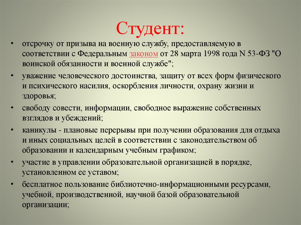 Студент:• отсрочку от призыва на военную службу, предоставляемую в