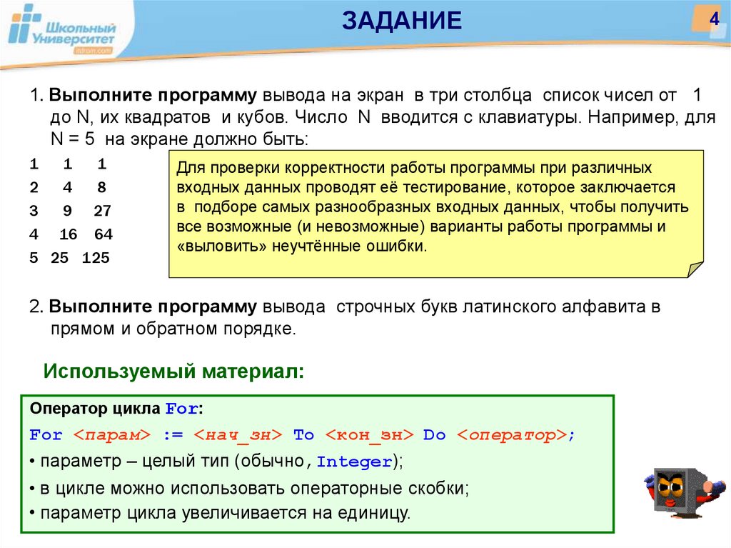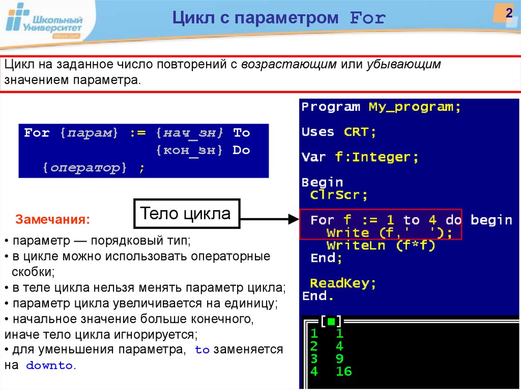 Цикл с параметром ForЦикл на заданное число повторений с возрастающим или убывающим