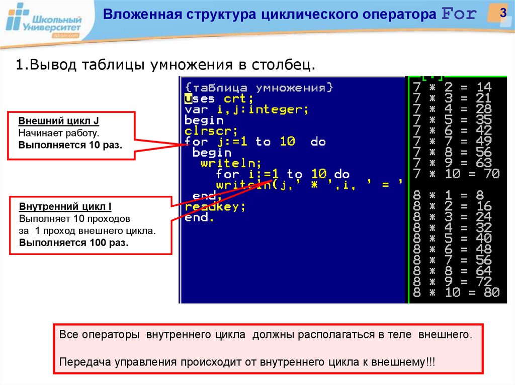 Вложенная структура циклического оператора For1.Вывод таблицы умножения в столбец.