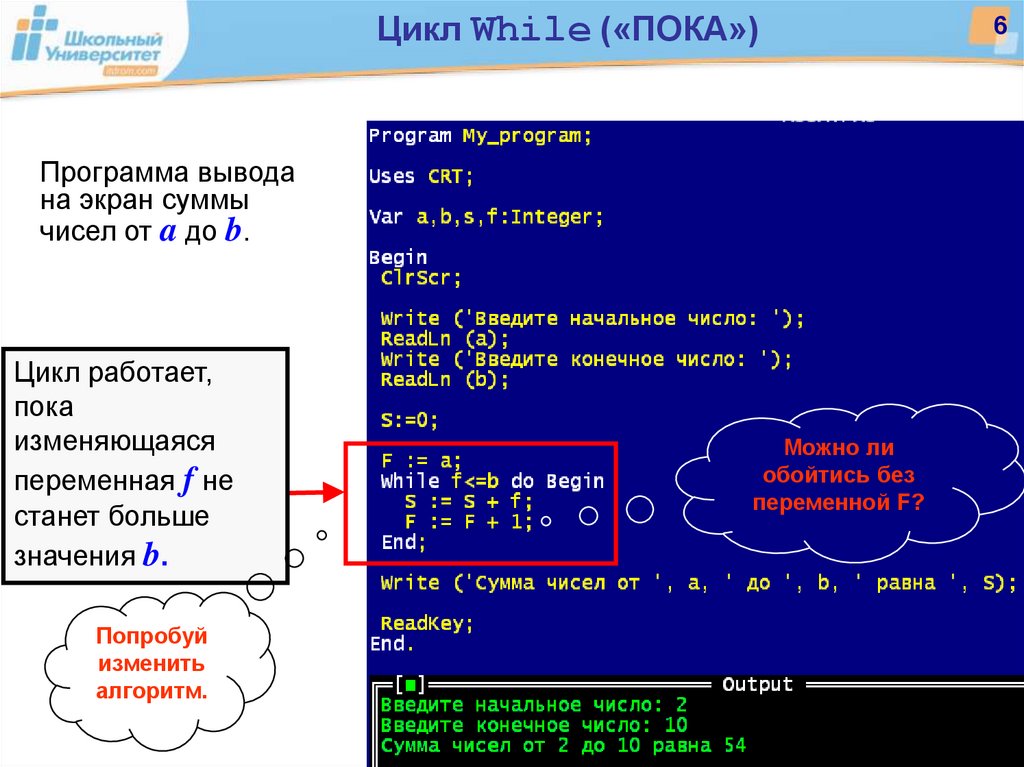 Цикл While («ПОКА»)Цикл While сначала проверяет условие, и только если оно истинно,