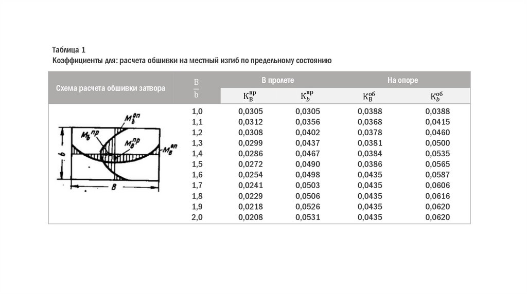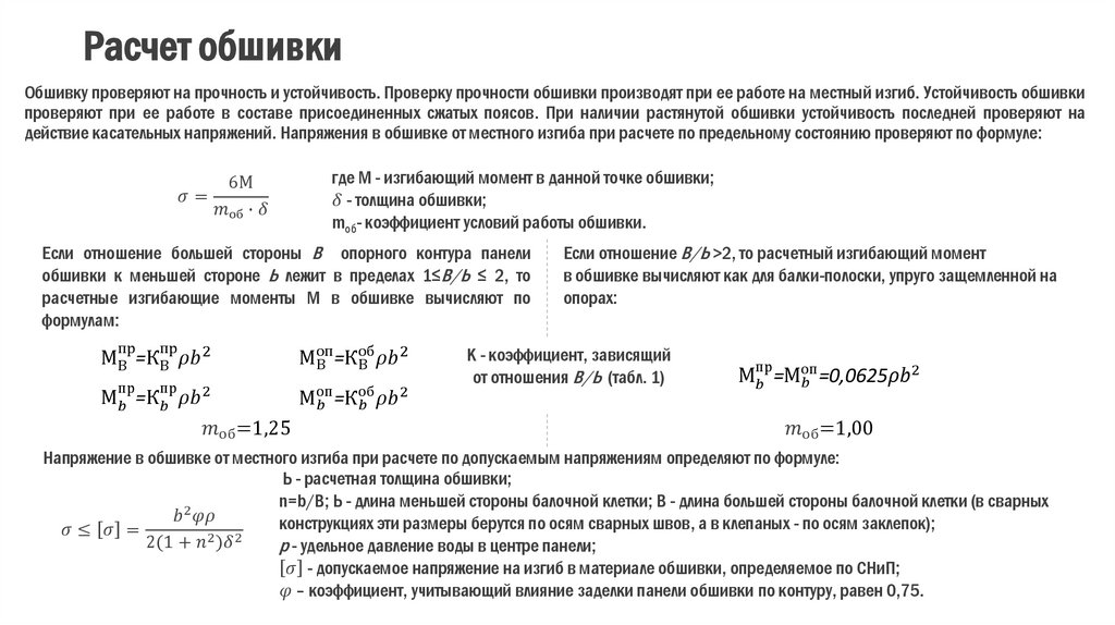 действие касательных напряжений. Напряжения в обшивке от местного изгиба при расчете по предельному состоянию проверяют по формуле: