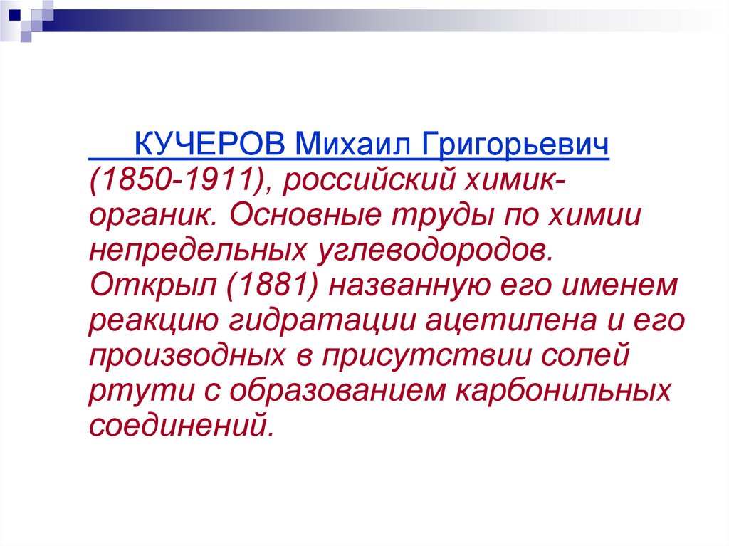 КУЧЕРОВ Михаил Григорьевич(1850-1911), российский химикорганик. Основные труды по химии