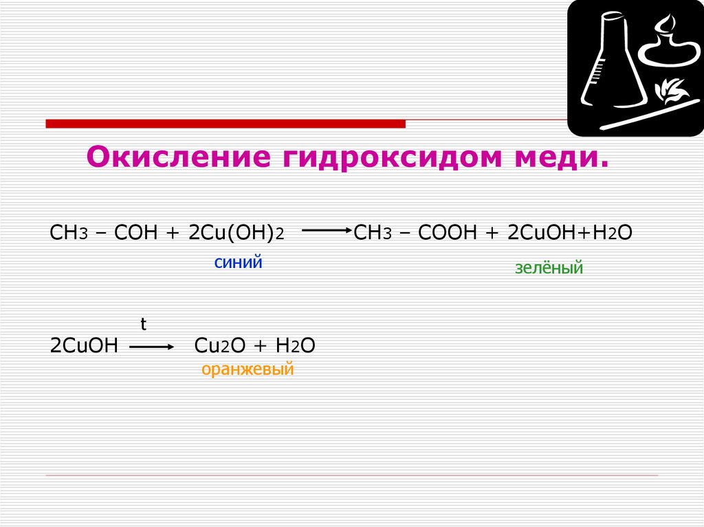 Окисление гидроксидом меди.СН3 – СОН + 2Cu(ОН)2
