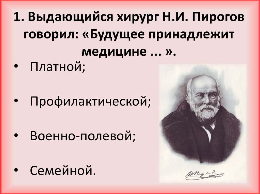 1. Выдающийся хирург Н.И. Пироговговорил: «Будущее принадлежит