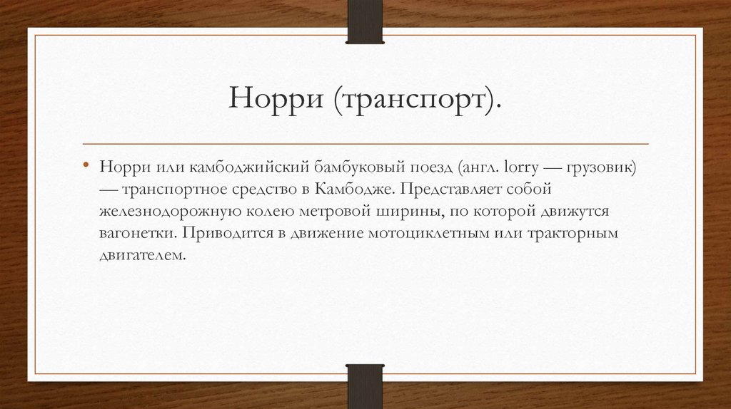 Норри (транспорт).• Норри или камбоджийский бамбуковый поезд (англ. lorry — грузовик)