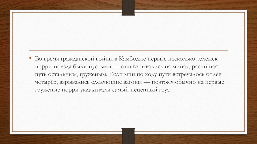 • Во время гражданской войны в Камбодже первые несколько тележекнорри-поезда были пустыми — они взрывались на минах, расчищая