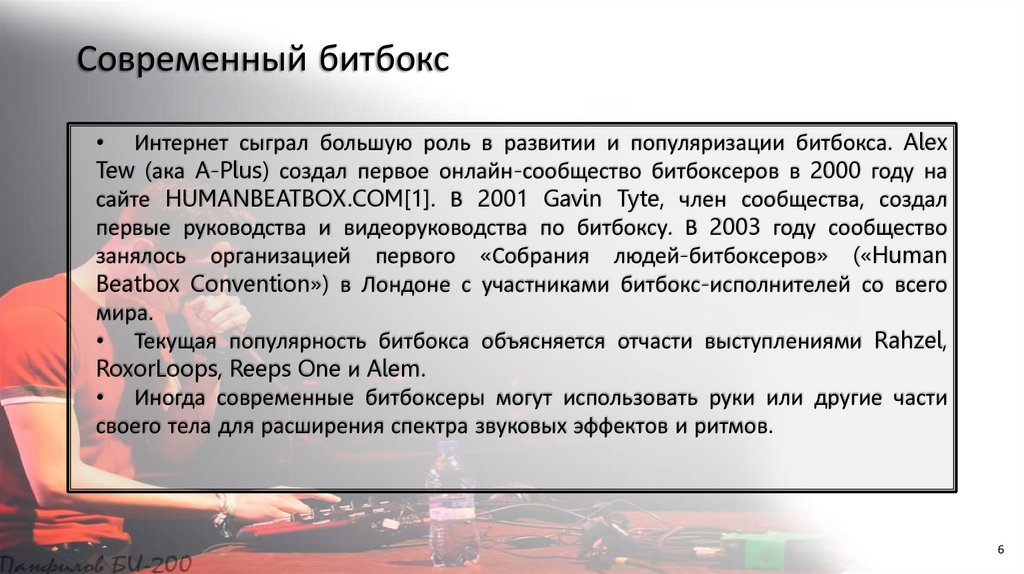 Современный битбокс• Интернет сыграл большую роль в развитии и популяризации битбокса. Alex