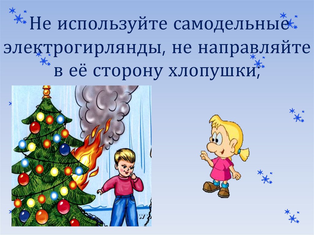 Не используйте самодельныеэлектрогирлянды, не направляйте