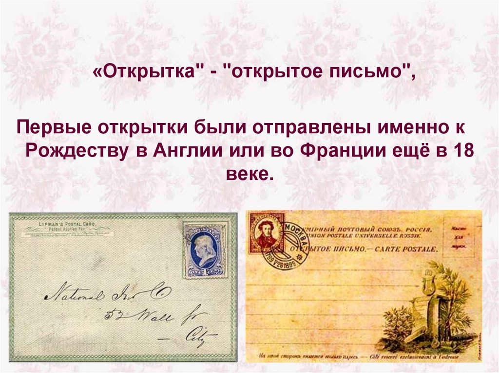 «Открытка" - "открытое письмо",Первые открытки были отправлены именно к