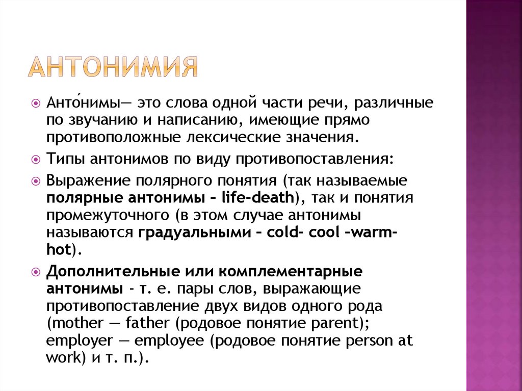 Анто́нимы— это слова одной части речи, различныепо звучанию и написанию, имеющие прямо