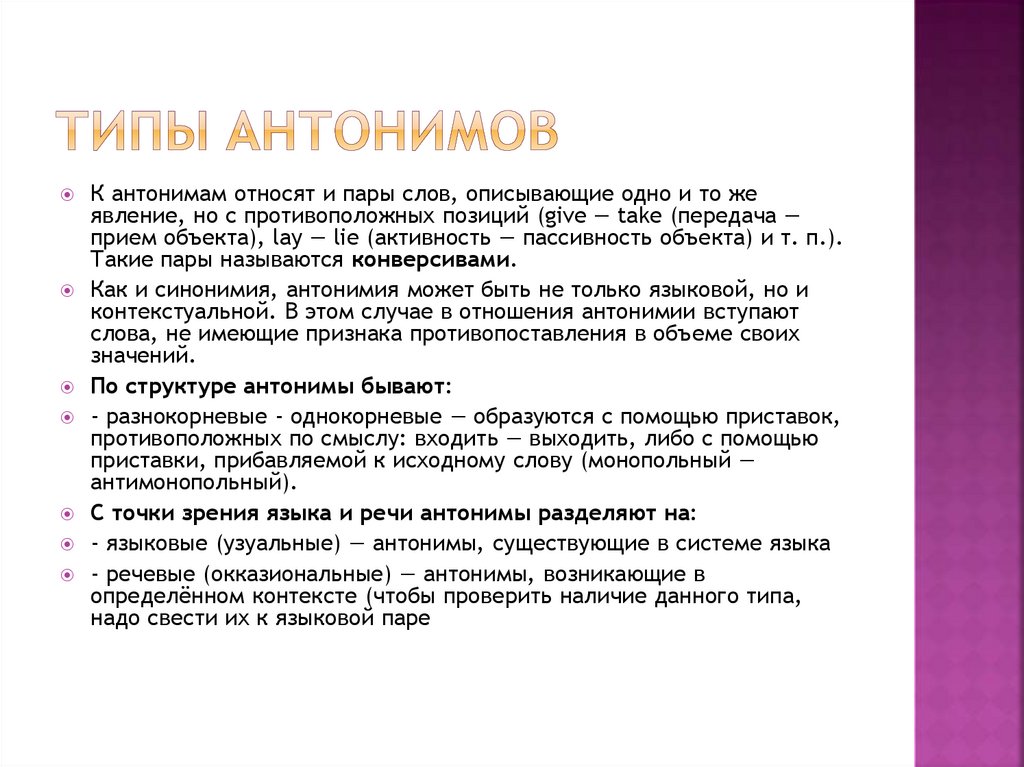К антонимам относят и пары слов, описывающие одно и то жеявление, но с противоположных позиций (give — take (передача —