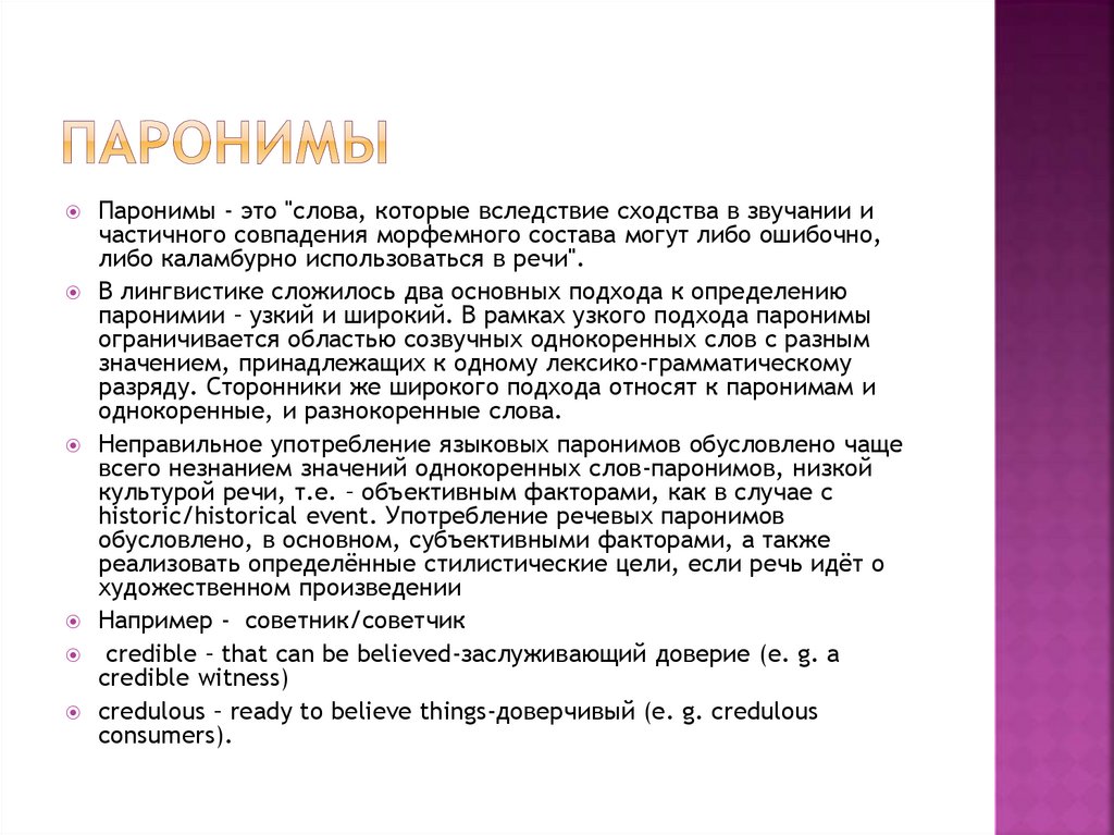 паронимии – узкий и широкий. В рамках узкого подхода паронимы