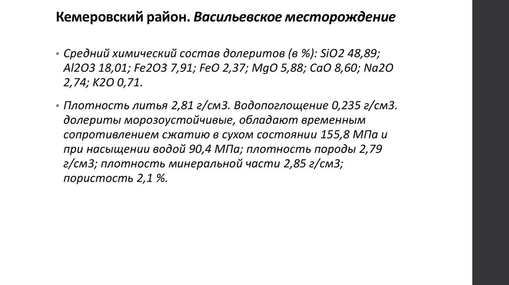 Кемеровский район. Васильевское месторождениеСредний химический состав долеритов (в %): SiO2 48,89;