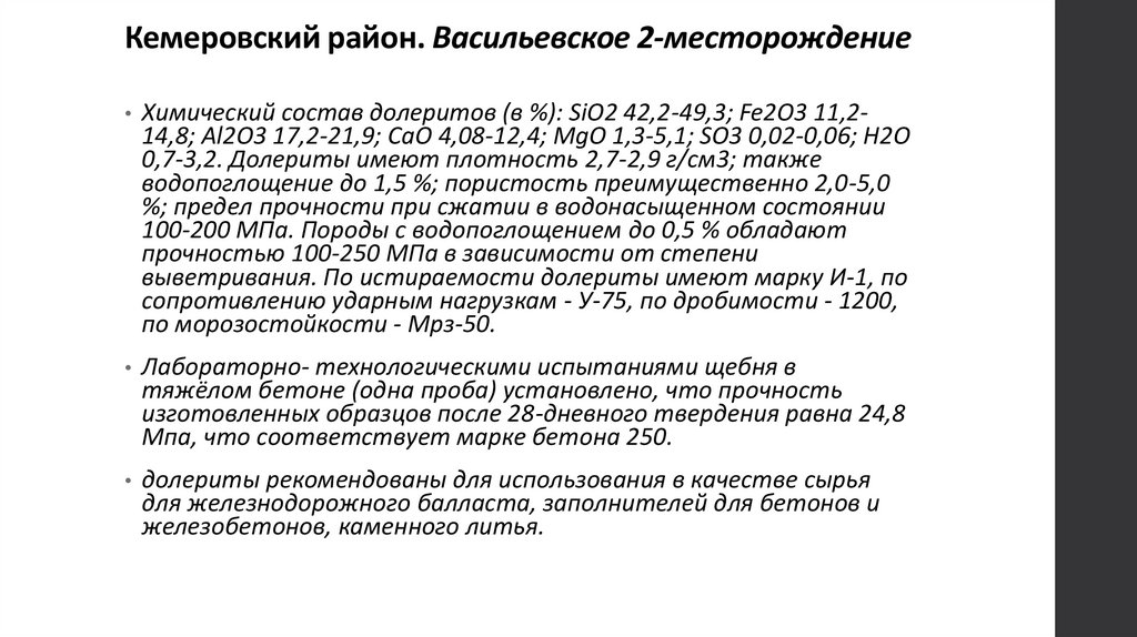 Кемеровский район. Васильевское 2-месторождениеХимический состав долеритов (в %): SiO2 42,2-49,3; Fe2O3 11,214,8; Al2О3 17,2-21,9; CaO 4,08-12,4; MgO 1,3-5,1; SO3 0,02-0,06; H2O