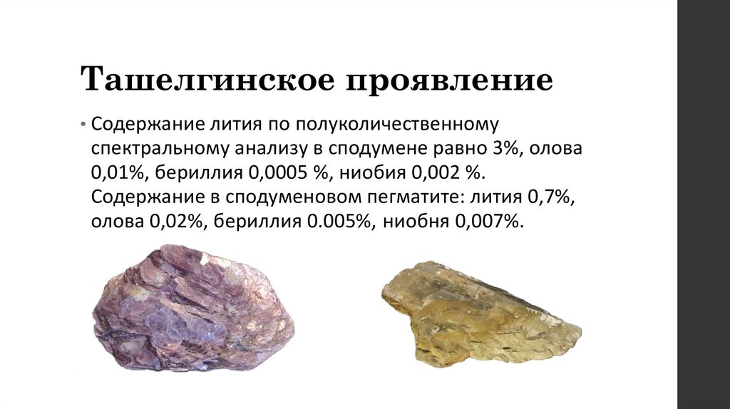 Ташелгинское проявление• Содержание лития по