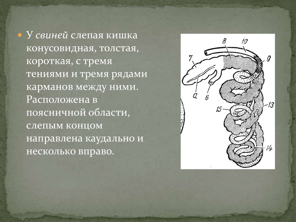 У свиней слепая кишкаконусовидная, толстая,