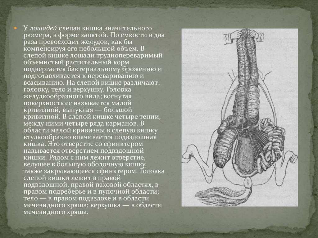У лошадей слепая кишка значительногоразмера, в форме запятой. По емкости в два