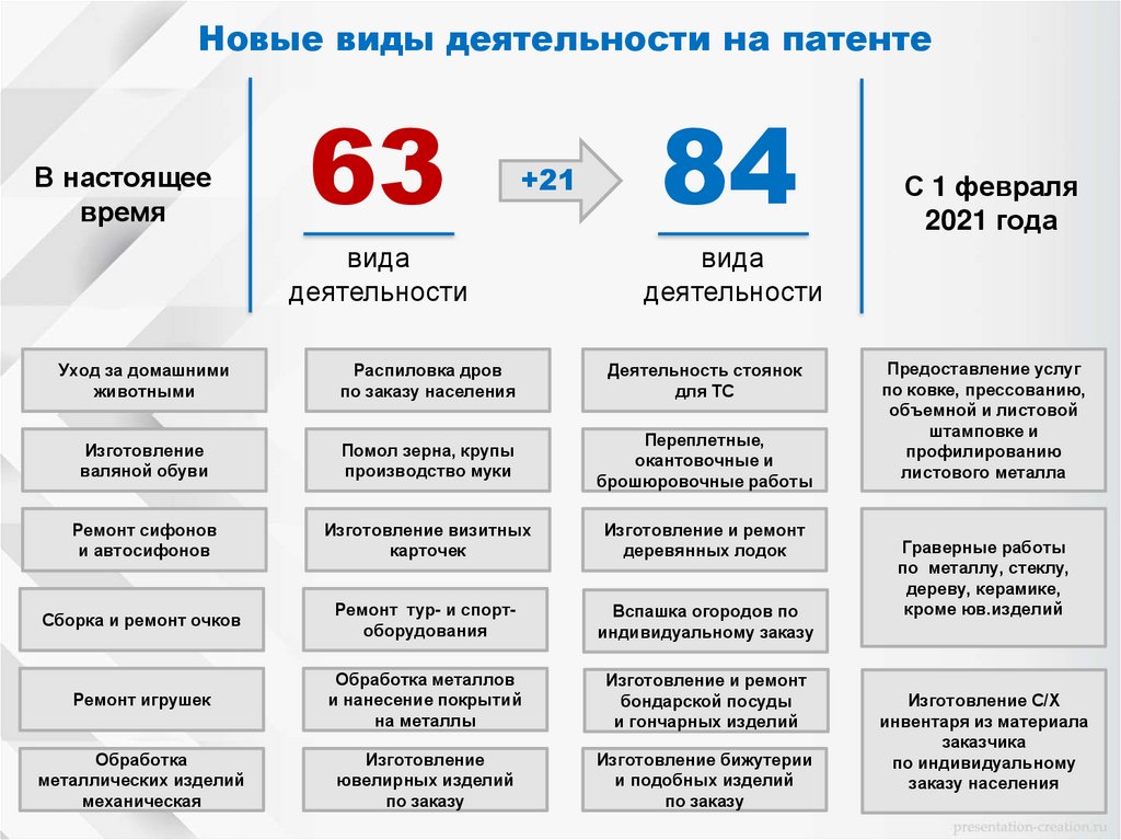 Новые виды деятельности на патентеВ настоящее