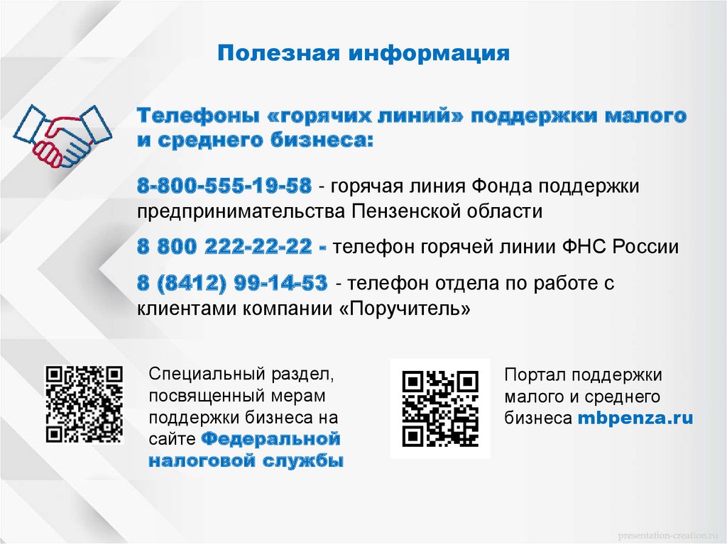Полезная информацияТелефоны «горячих линий» поддержки малого