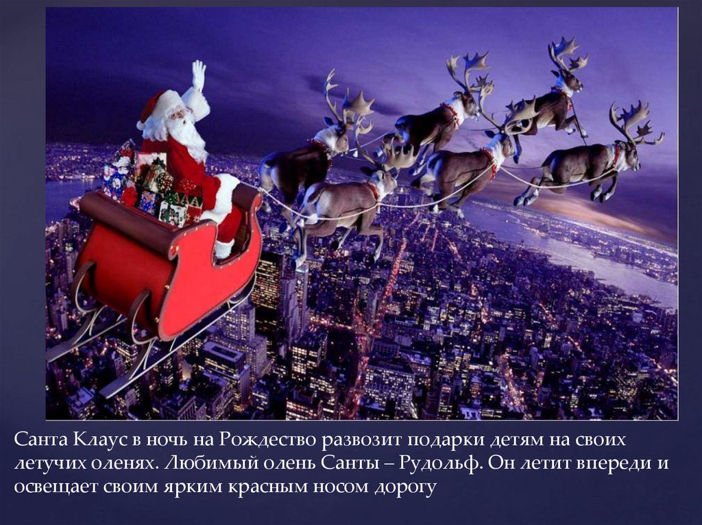 Санта Клаус в ночь на Рождество развозит подарки детям на своихлетучих оленях. Любимый олень Санты – Рудольф. Он летит впереди и