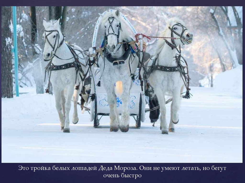Это тройка белых лошадей Деда Мороза. Они не умеют летать, но бегуточень быстро