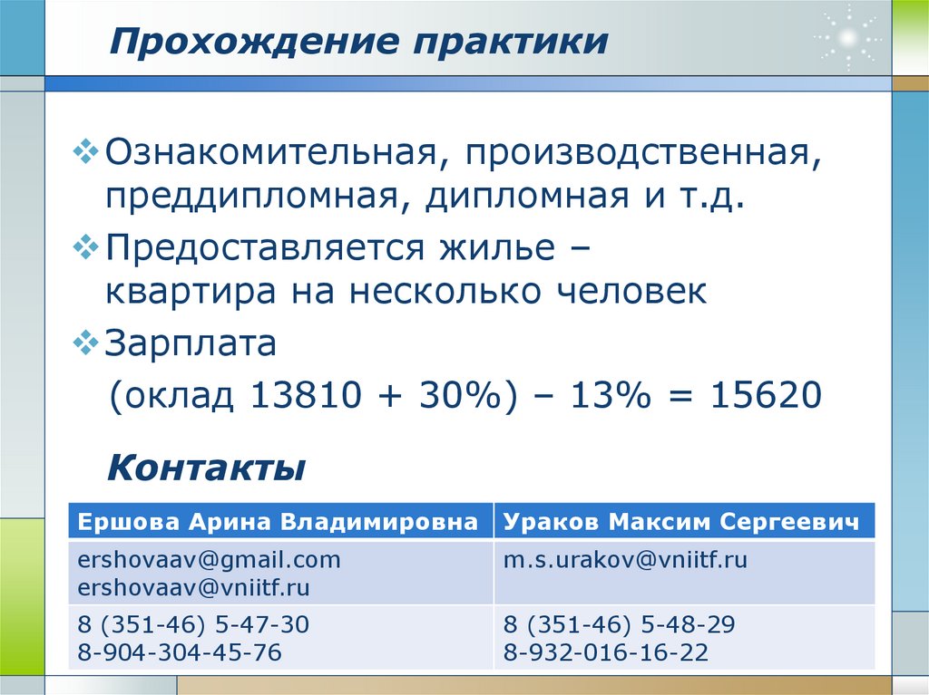 Прохождение практикиОзнакомительная, производственная,