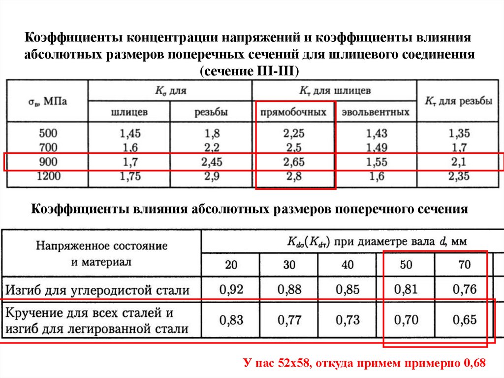 Коэффициенты концентрации напряжений и коэффициенты влиянияабсолютных размеров поперечных сечений для шлицевого соединения