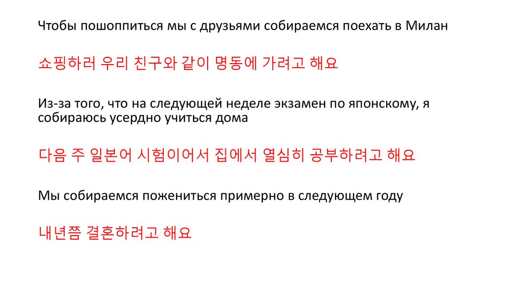 Чтобы пошоппиться мы с друзьями собираемся поехать в Милан쇼핑하러 우리 친구와 같이 명동에 가려고 해요