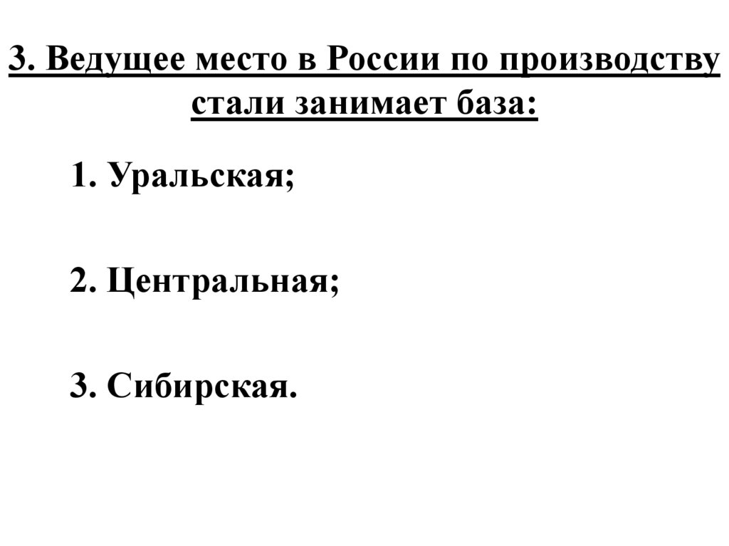 3. Ведущее место в России по производствустали занимает база: