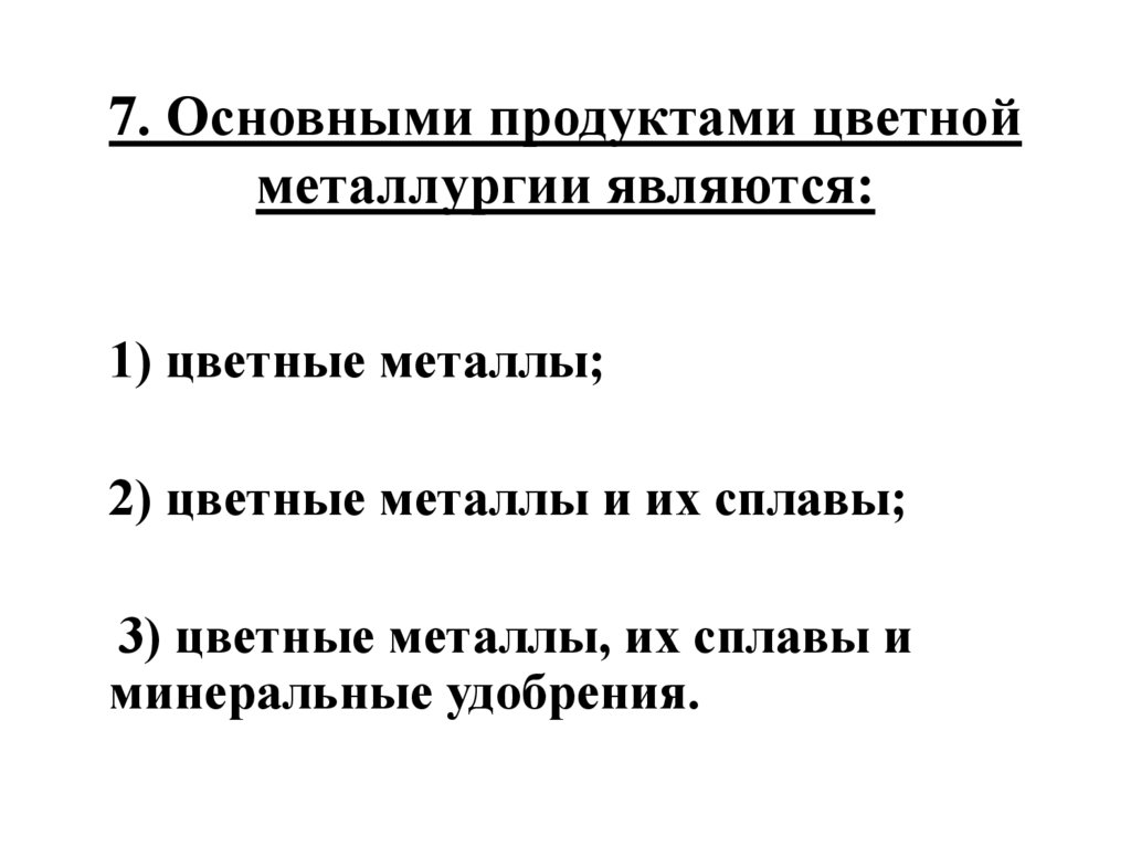 7. Основными продуктами цветнойметаллургии являются: