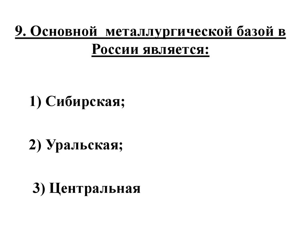 9. Основной металлургической базой вРоссии является: