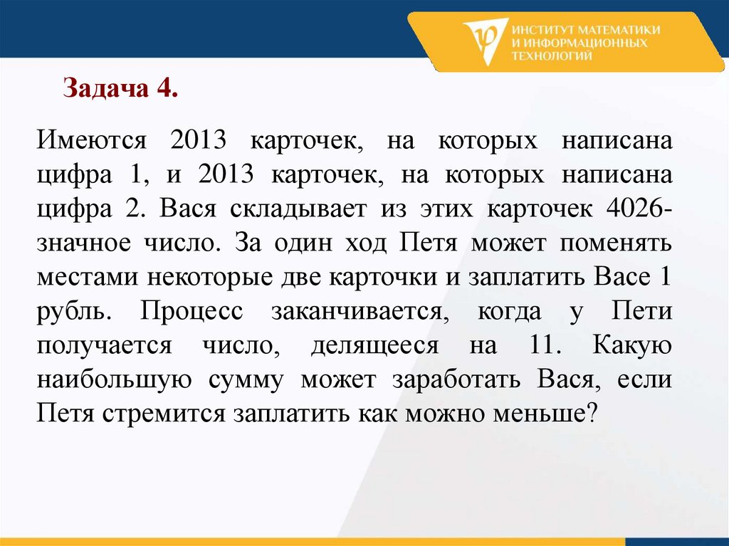 цифра 2. Вася складывает из этих карточек 4026значное число. За один ход Петя может поменять