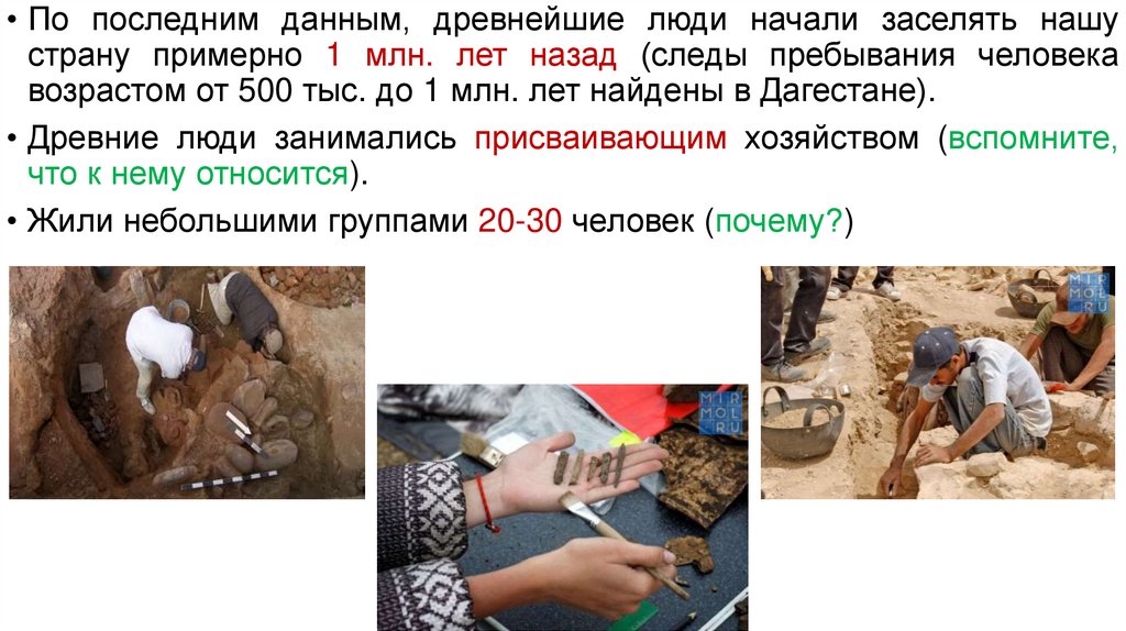 • По последним данным, древнейшие люди начали заселять нашустрану примерно 1 млн. лет назад (следы пребывания человека