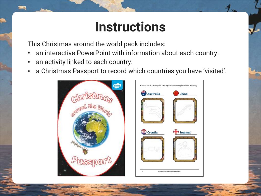 InstructionsThis Christmas around the world pack includes: