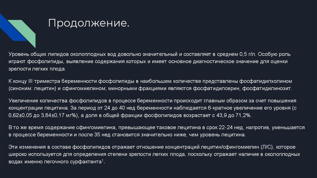 Эти изменения в составе фосфолипидов отражает отношение концентраций лецитин/сфингомиелин (Л/С), которое